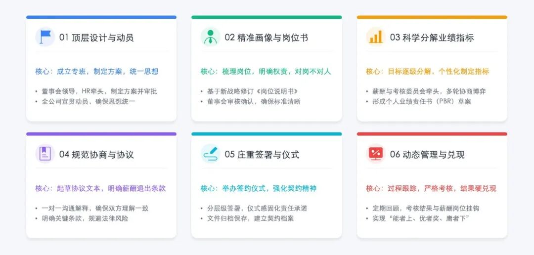 2. 年度/任期經(jīng)營(yíng)業(yè)績(jī)責(zé)任書:行動(dòng)的“軍令狀” 這是契約的核心。它將公司戰(zhàn)略目標(biāo),轉(zhuǎn)化為經(jīng)理層個(gè)人頭上可衡量、可考核、可追溯的具體指標(biāo)。其設(shè)計(jì)需遵循“SMART+”原則,并通常包含四類指標(biāo): 效益類(KPI):如利潤(rùn)總額、凈資產(chǎn)收益率,體現(xiàn)價(jià)值創(chuàng)造。 戰(zhàn)略類:如技術(shù)創(chuàng)新、市場(chǎng)開拓項(xiàng)目,體現(xiàn)發(fā)展?fàn)恳?/span> 分類指標(biāo):根據(jù)企業(yè)功能定位和行業(yè)特性設(shè)定,如科研投入強(qiáng)度、服務(wù)質(zhì)量。 紅線指標(biāo):如安全、環(huán)保、廉政、風(fēng)險(xiǎn)防控,體現(xiàn)底線約束。 目標(biāo)值的確定,需結(jié)合歷史、行業(yè)與戰(zhàn)略要求,通過協(xié)商達(dá)成,具備挑戰(zhàn)性。 3. 聘任協(xié)議:關(guān)系的“總框架” 這份法律文件,正式確立了董事會(huì)與經(jīng)理層成員之間的契約關(guān)系。它明確約定了聘任職位、任期(通常為三年)、雙方權(quán)利義務(wù)、薪酬結(jié)構(gòu)與支付方式、考核結(jié)果應(yīng)用,以及各類退出情形(包括任期屆滿未續(xù)聘、考核不合格、協(xié)商解聘、責(zé)任解聘等)。它確保了整個(gè)管理關(guān)系在法治軌道上運(yùn)行,是實(shí)現(xiàn)“能上能下、能進(jìn)能出”的最終保障。 三、六步走:落地實(shí)施全流程指南