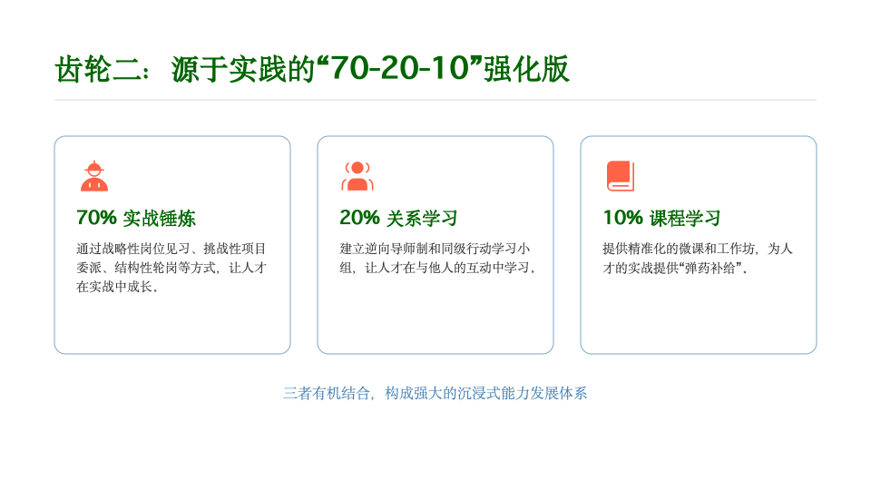 堅信領導力源于實踐而非課堂。構建“70-20-10”法則的強化版應用: