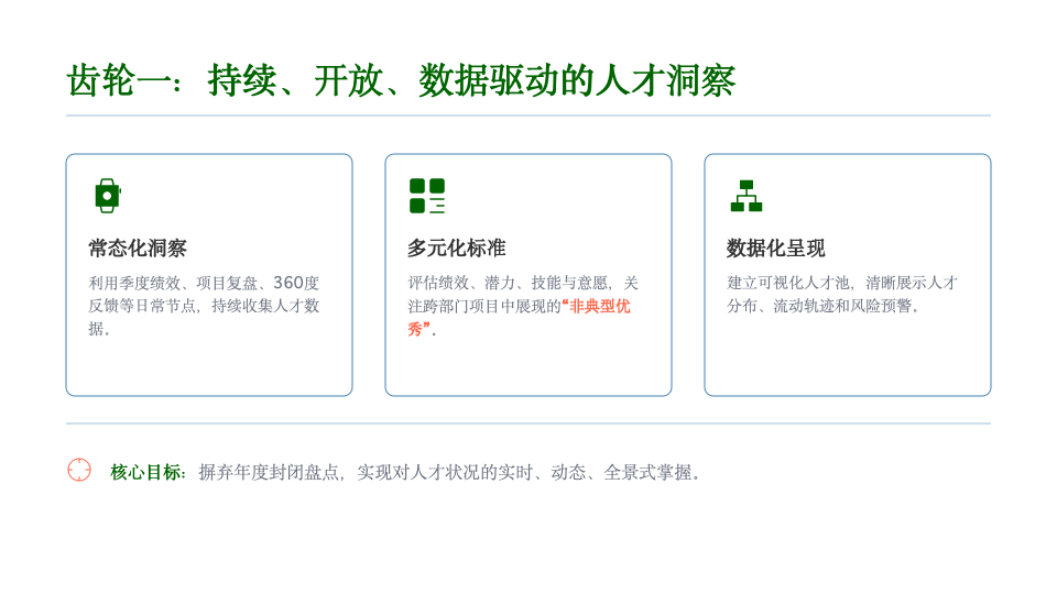 摒棄一年一度、關起門來的封閉盤點,建立持續(xù)、開放、數(shù)據(jù)驅(qū)動的人才洞察體系。
