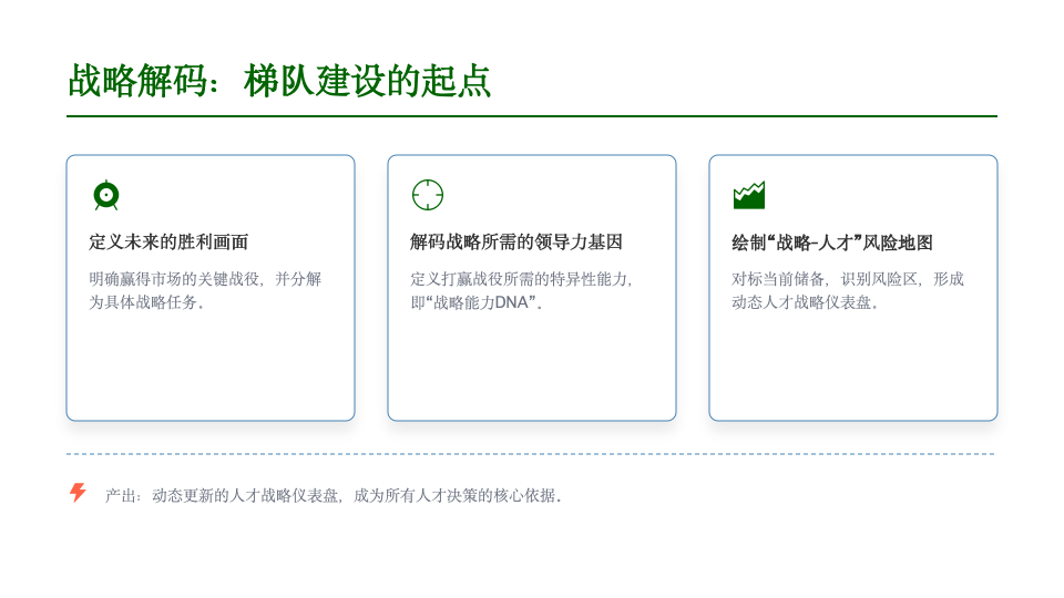 此過程產(chǎn)出不再是一份靜態(tài)的報告,而是一個隨著戰(zhàn)略復盤(建議每季度一次)而動態(tài)更新的“人才戰(zhàn)略儀表盤”,成為管理層決策的核心輸入之一。